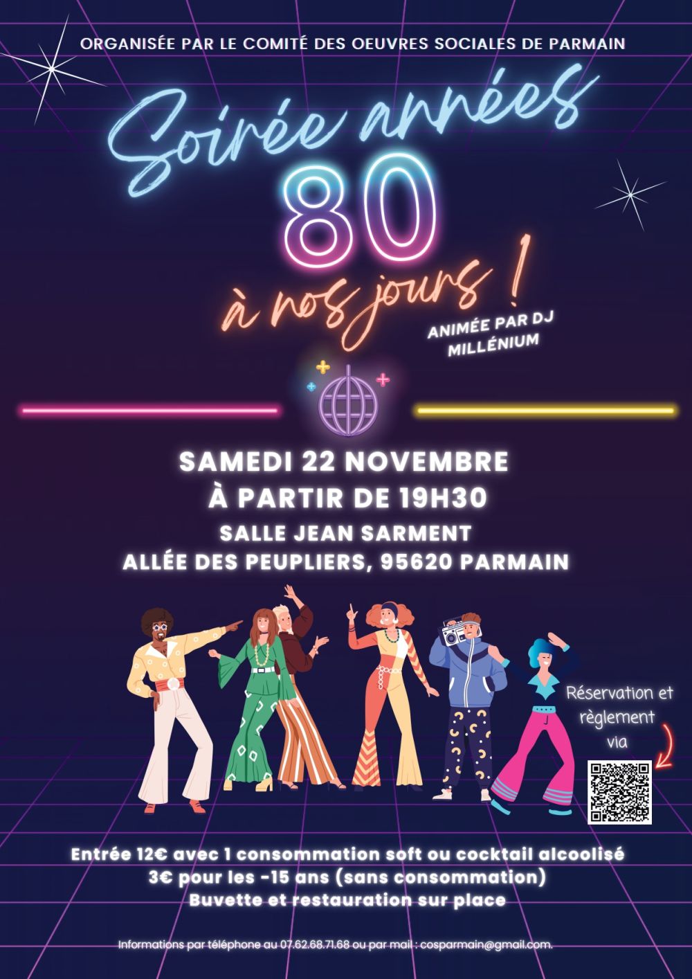 Lien pour réservation et paiement :https://cos-du-personnel-de-la-commune-de-parmain.assoconnect.com/collect/description/609020-v-soiree-annees-80-a-nos-jours