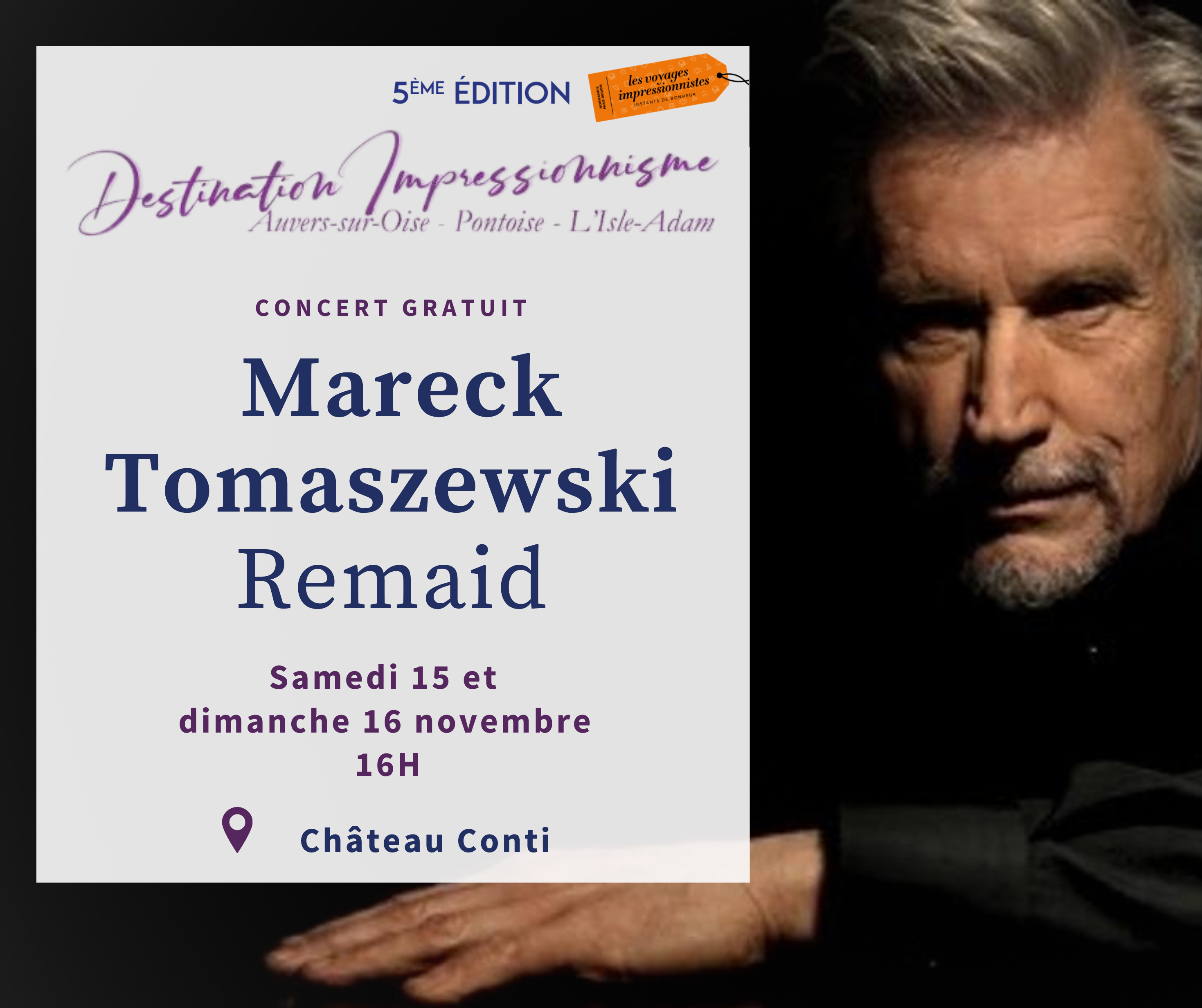 15nov(nov 15)16 h 00 min16(nov 16)18 h 00 minConcert Mareck Tomaszewski – Remaid16 h 00 min - 18 h 00 min (16) Cinéma Le Conti, Place du Patis 95290 L'Isle-Adam