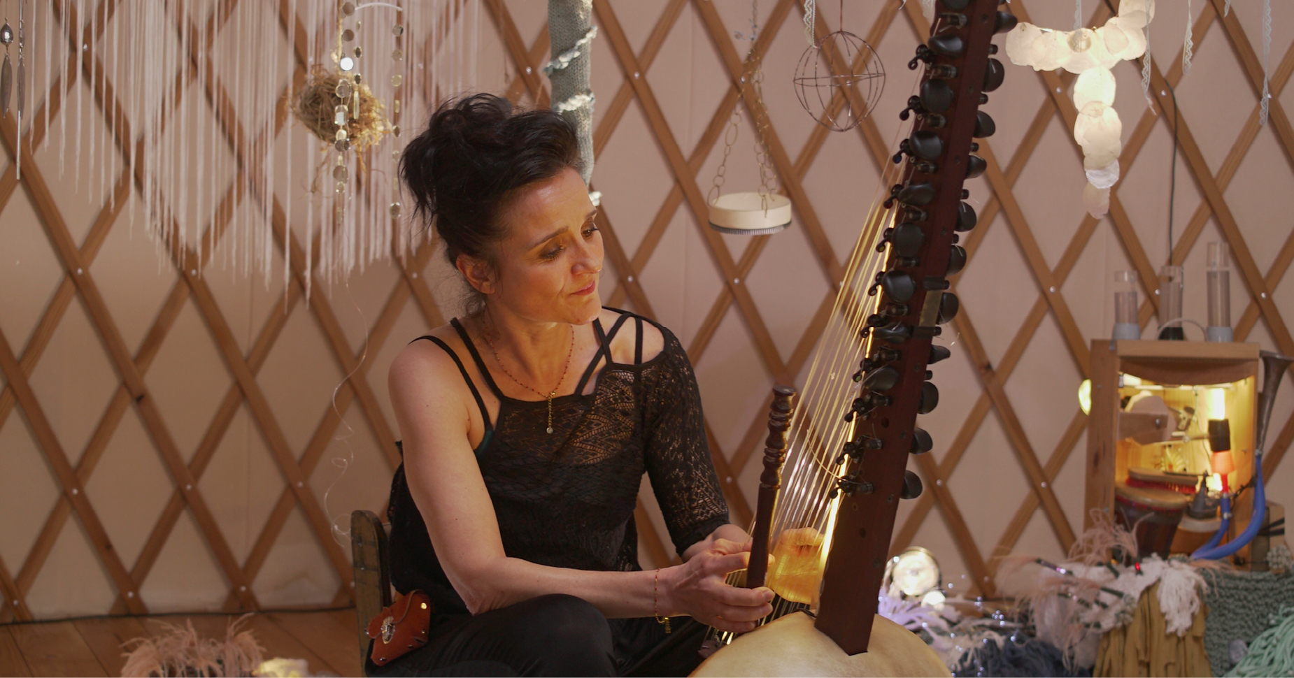 Une joueuse de kora, instrument à cordes au son doux et cristallin, installée sous son parasol d’oiseaux, de coquillages et de vent, vous